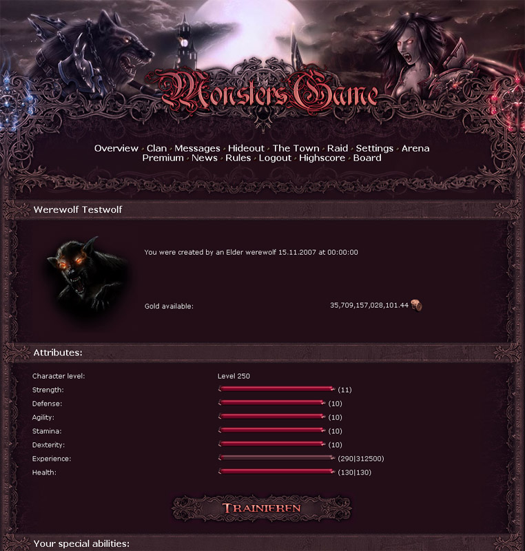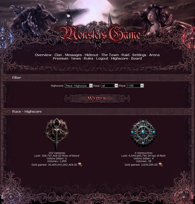 Vous n'avez besoin de rien de plus qu'une connexion Internet et un navigateur pour jouer à MonstersGame. Cliquez sur « S'inscrire » et décidez si vous voulez joindre le clan des vampires ou de celui des loups-garous. L'enregistrement est très simple, ne vous coûte rien et il n'y a aucun autre engagement sur votre part. Une fois que vous vous êtes enregistré, vous vous trouvez à la page de vue d'ensemble de votre personnage RPG. C'est là que vous pouvez trouver des informations importantes sur votre personnage et également votre lien de morsure, avec lequel vous pouvez faire de nouvelles des victimes, loin de votre atteinte sur Internet, en plaçant le lien de façon appropriée. Par exemple, vous pouvez envoyer le lien à vos amis, le placer sur votre page perso ou l'employer comme signature dans les forum. Si une victime clique sur votre lien, vous le ou la mordez et sucez 1-3 litres de sang (en tant que vampire) ou dévorez 1-3 kilogrammes de chair (comme loup-garou). En plus, la même quantité d'or sera créditée sur votre compte de jeu. Si votre victime s'inscrit à MonstersGame, vous avez créé un nouveau vampire/loup-garou et vous recevez 25% du butin que il/elle reçoit de ses propres victimes via l'Internet ! Une fois que le personnage(s) que vous avez créé par l'intermédiaire de votre lien de morsure a atteint le niveau 3, vous recevez 50 pièces d'or et 1 point d'expérience ! Vous pouvez investir votre or dans la formation pour que votre personnage, afin d'améliorer ses compétences ou vous pouvez acheter et augmenter votre Repaire pour mieux vous protéger contre les attaques de vos ennemies.